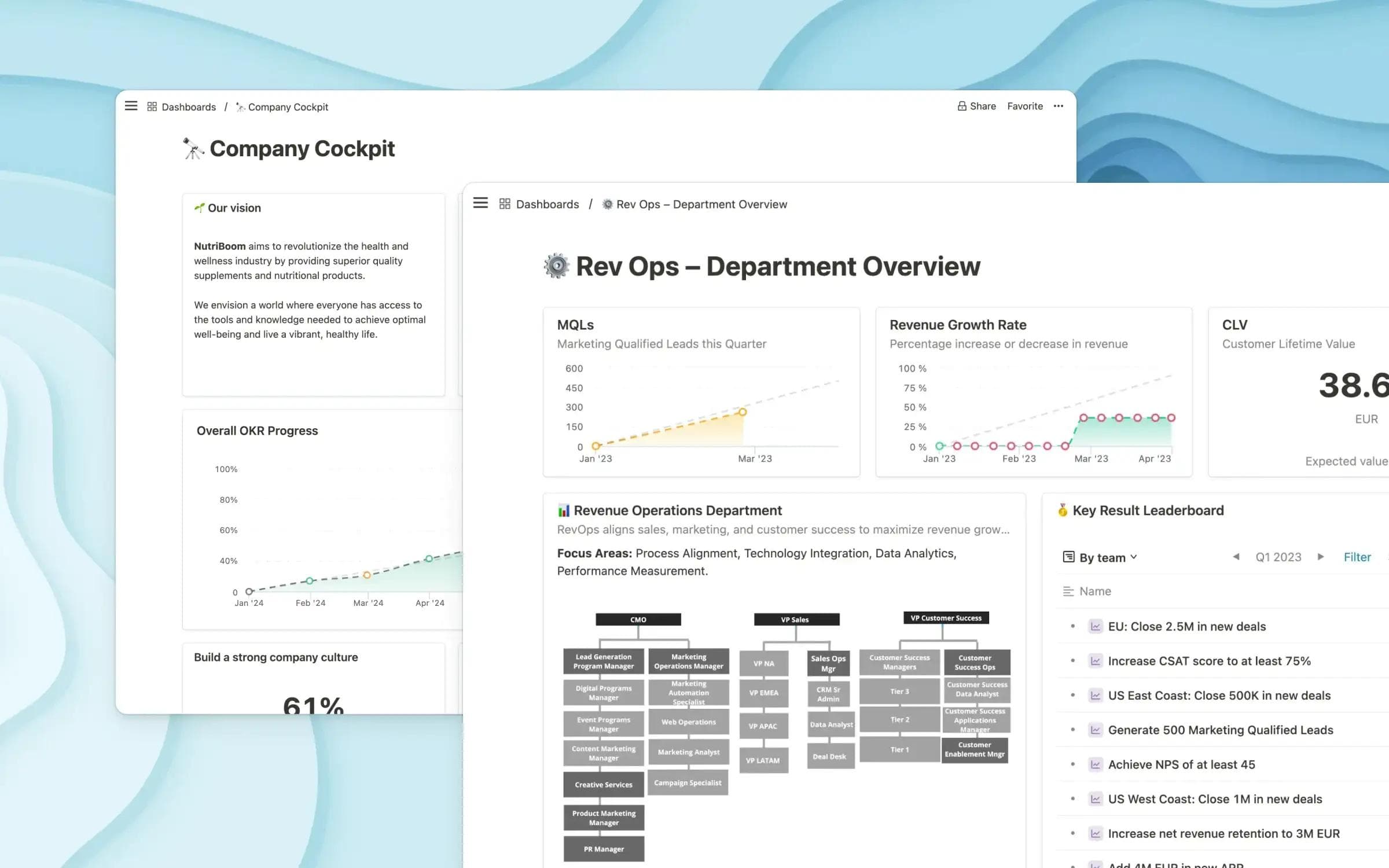 - Customizable dashboards: Quantive allows teams to customize dashboards to focus on relevant metrics during organizational changes, making it easier to assess how shifts in strategy affect performance.
