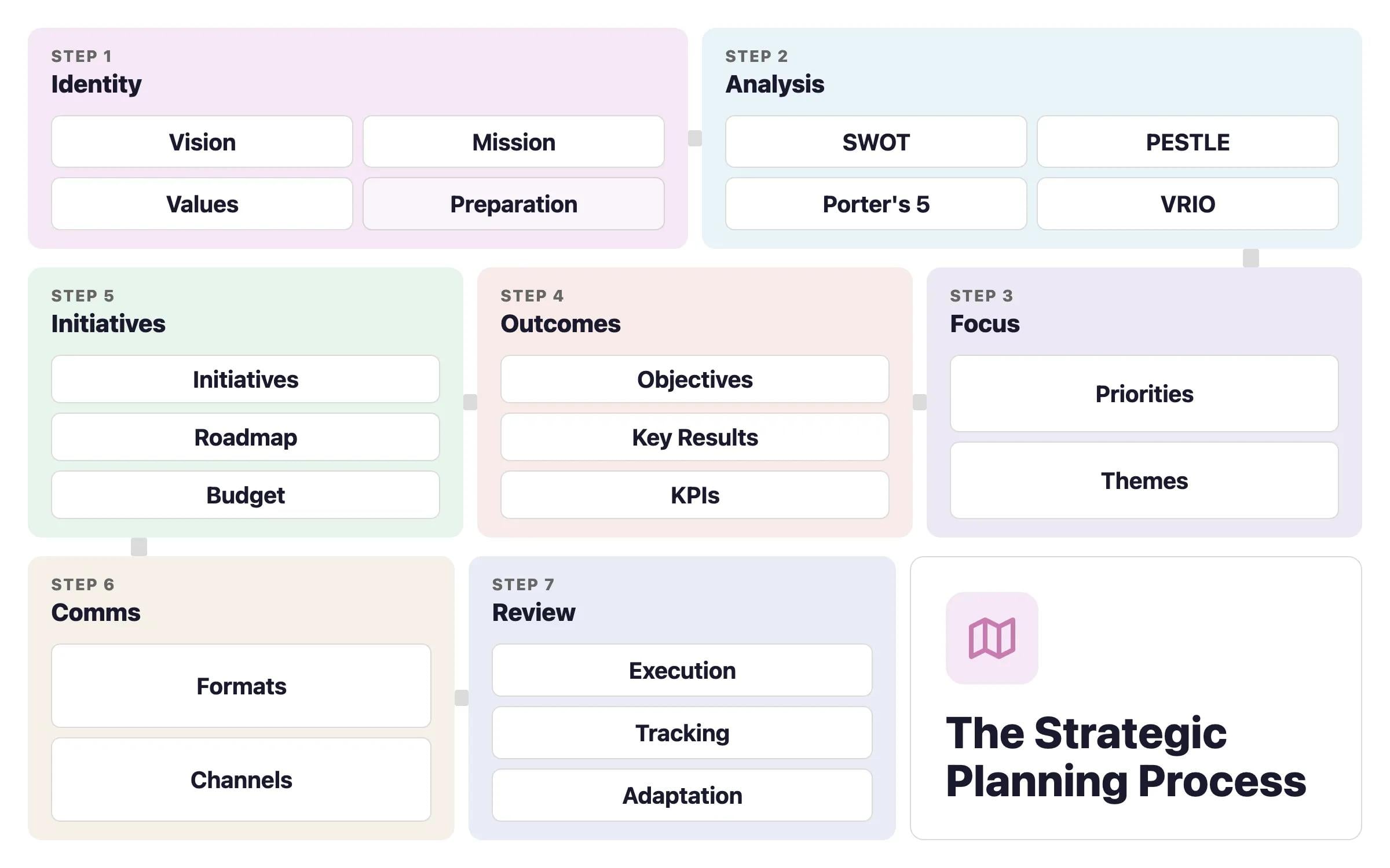 Obwohl jede Organisation einzigartig ist, ist die Anatomie eines guten strategischen Planungsprozesses universell. Im Folgenden findest du ein 7-Schritte-Framework, das von der abstrakten Identität zur konkreten Aktion führt.