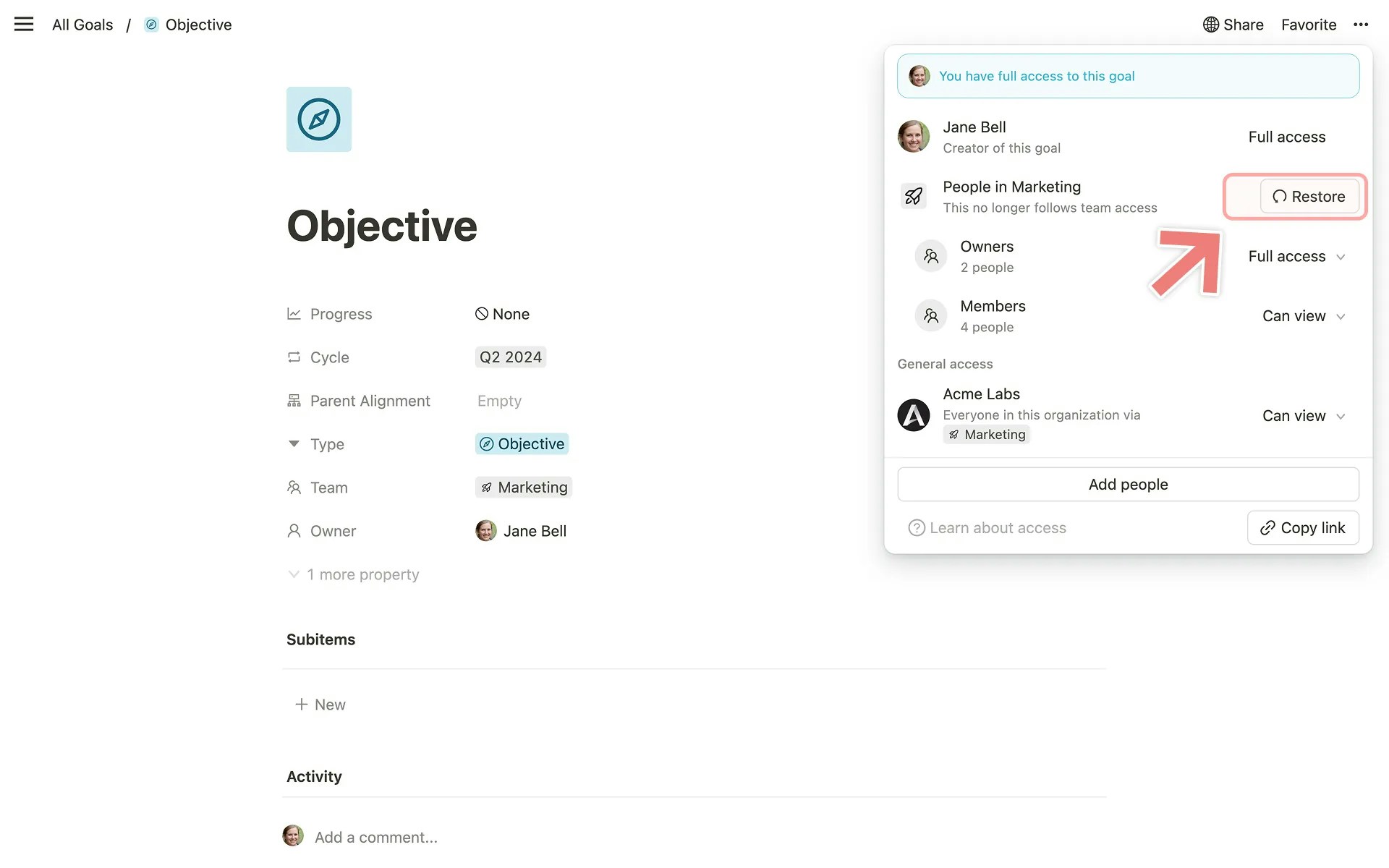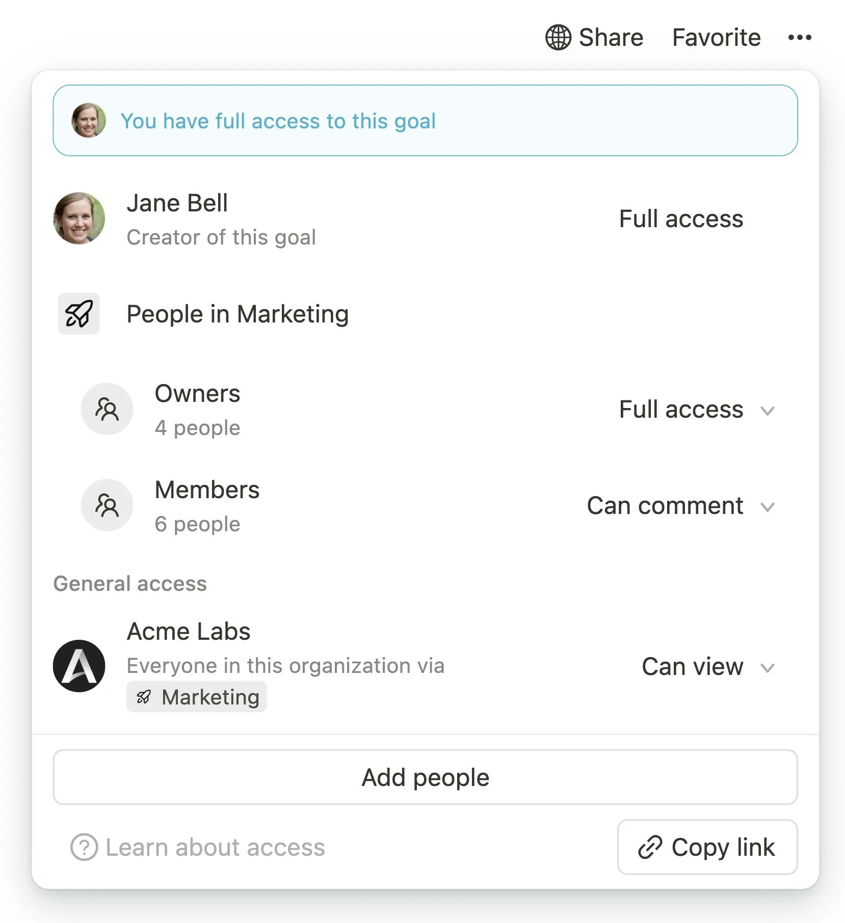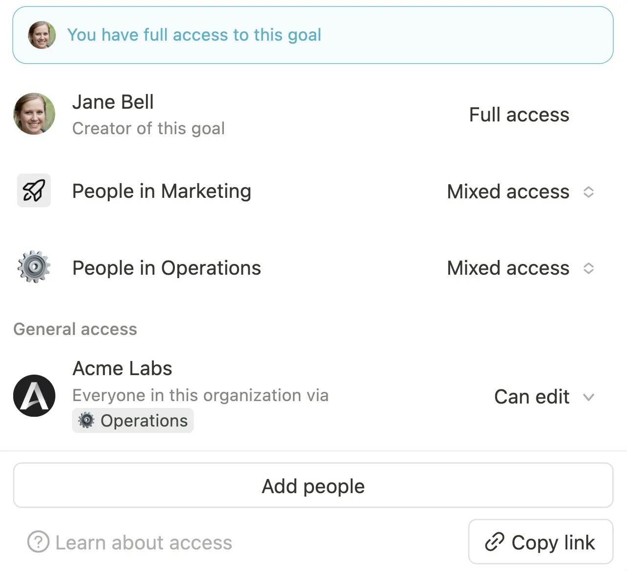 - Ziele, die innerhalb eines Teamspaces erstellt werden, werden automatisch mit den Teamspace-Berechtigungen verknüpft