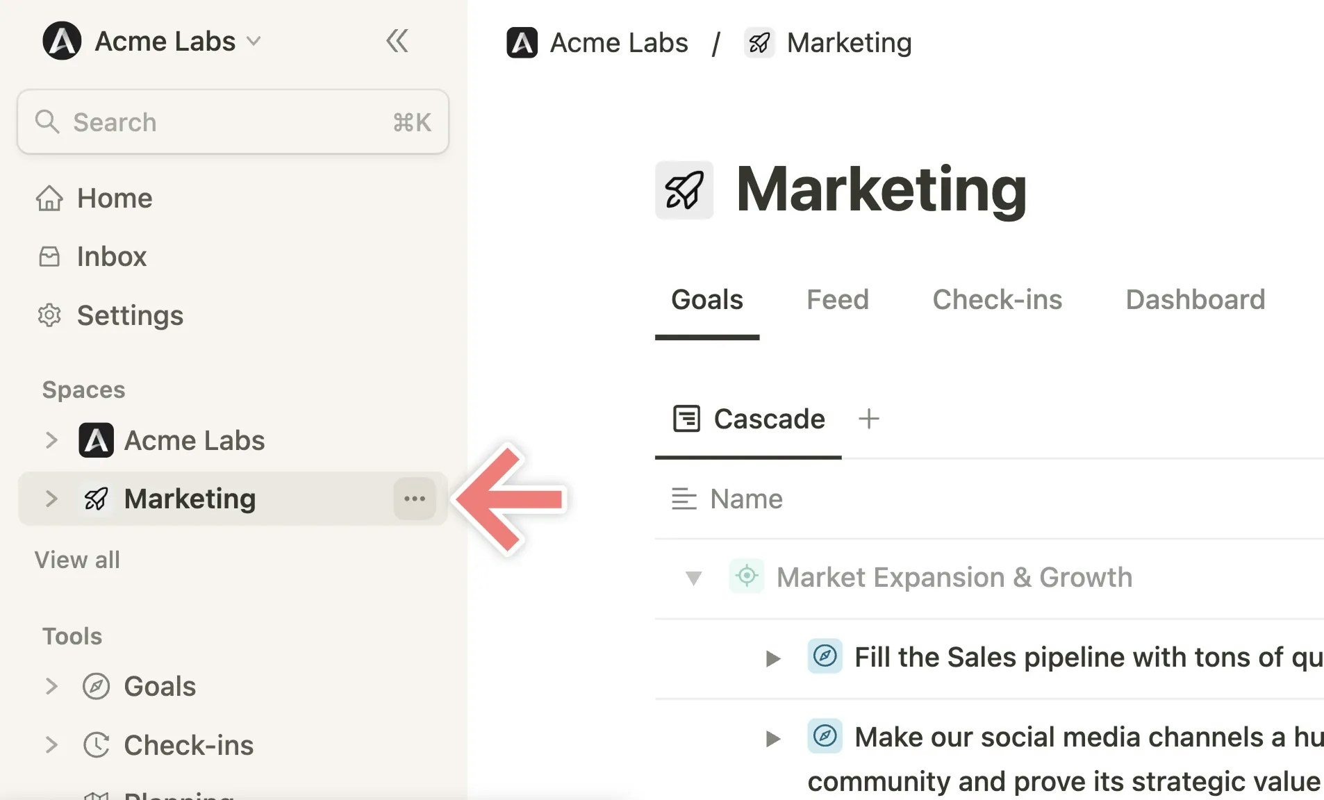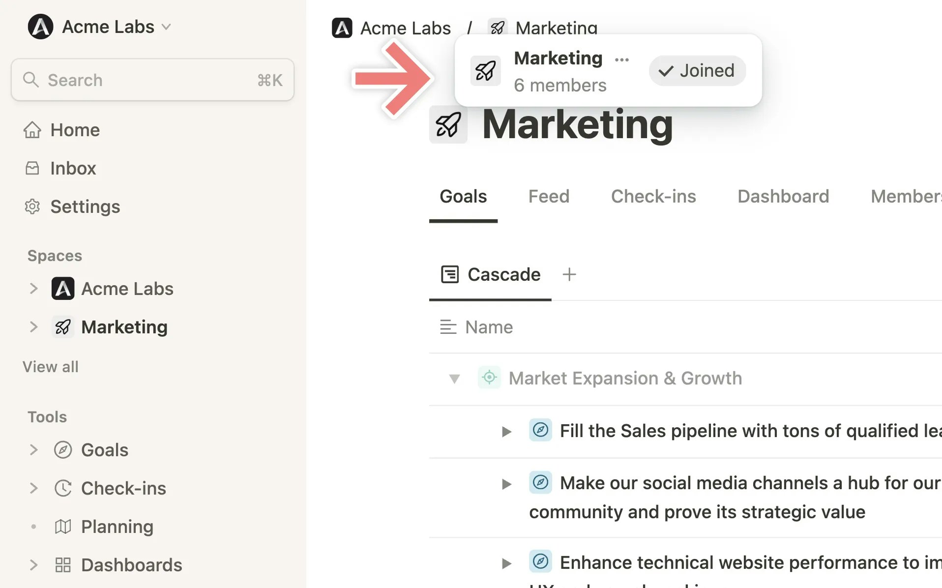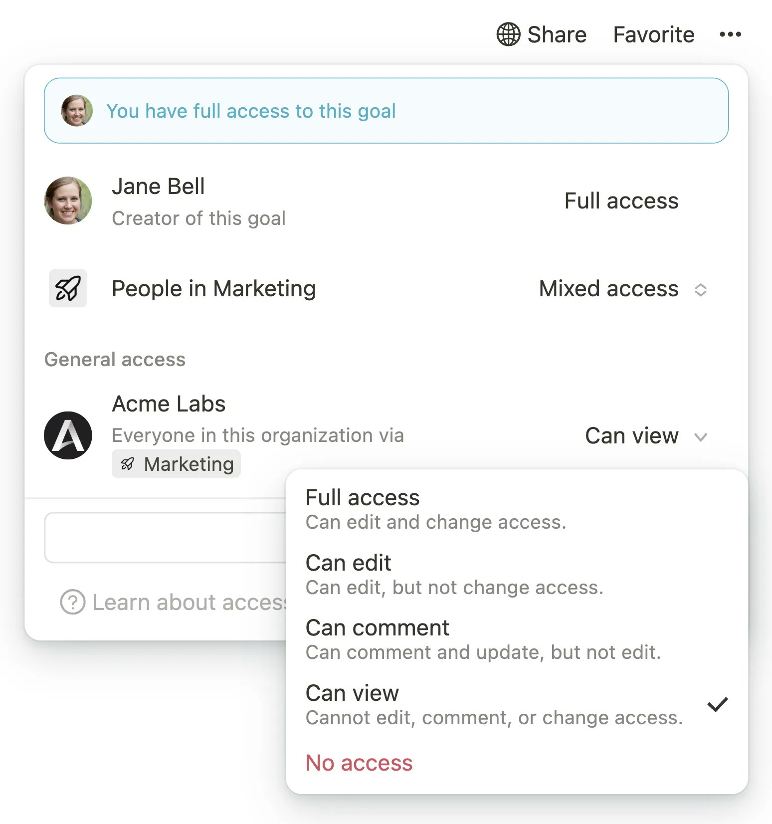 - Ziele, die innerhalb eines Teamspaces erstellt werden, werden automatisch mit den Teamspace-Berechtigungen verknüpft