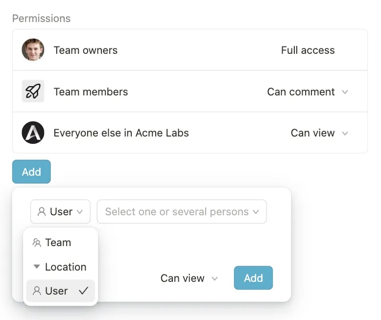 - Team: Wähle ein Team aus, um alle Personen des Teams Zugriffsrechte zu gewähren.
