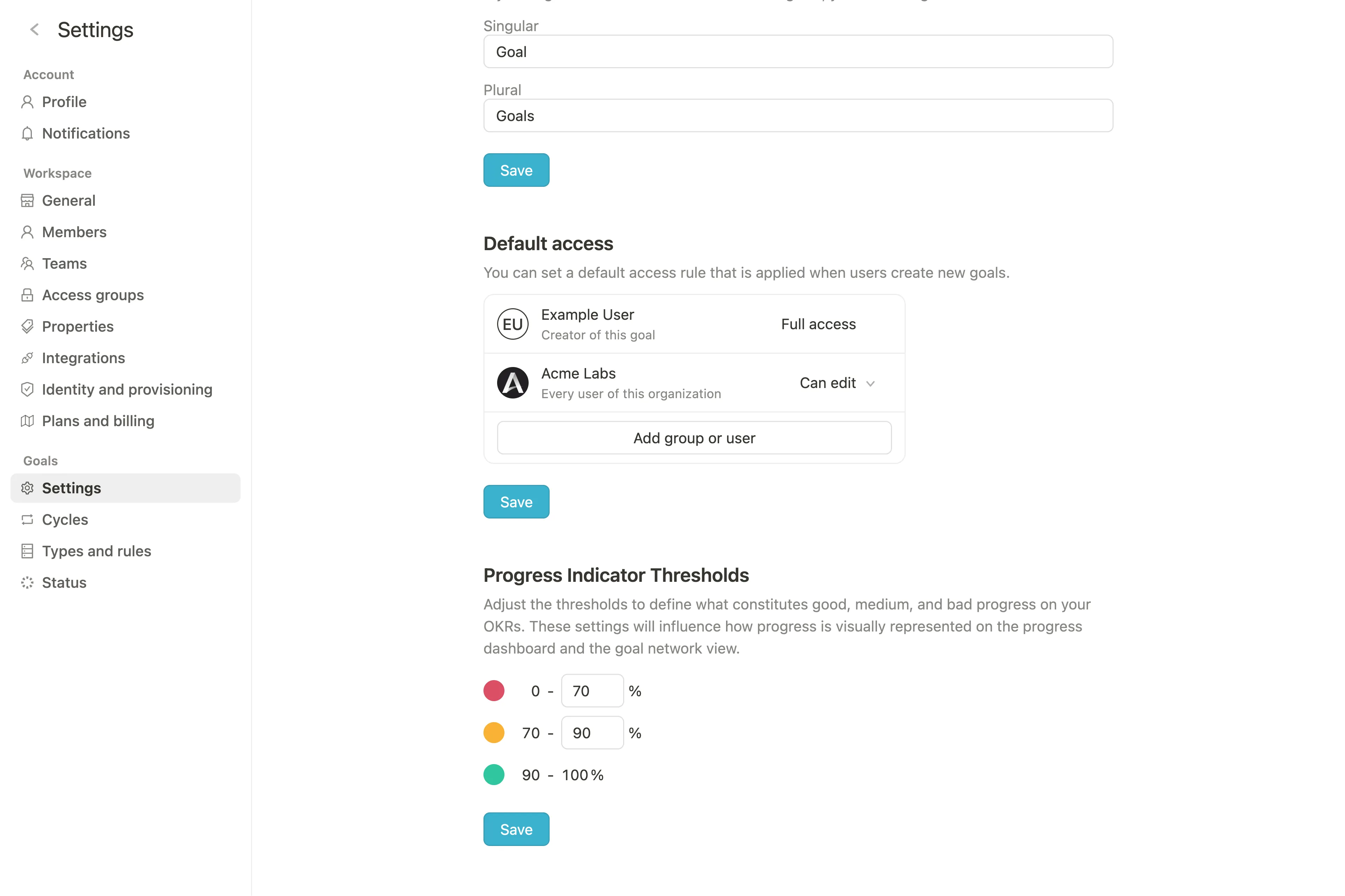 Neben der Zugriffsteuerung auf Teamspace-Ebene, gibt es für Admins auch die Möglichkeit, Standardzugriffsrechte für den gesamten Workspace festzulegen. Dieses Standardzugriffsrecht fungiert als “Auffangregel” für alle Ziele, die keinem Team zugewiesen sind (und damit nicht mit den Teamspace-Berechtigungen verknüpft sind). Alle Ziele, die außerhalb von Teamspaces erstellt werden, werden mit dieser Standardberechtigung erstellt. Wenn diese Ziele nachträglich einem oder mehreren Teams zugewiesen werden und die Teamspace-Berechtigungen dieser Teams höher sind als die Workspace-Standardberechtigung, wird die Standardberechtigung überschrieben. Darüber hinaus werden auch alle Teamspaces, die nach der Festlegung der Standardzugriffsrechte erstellt werden, mit diesen Standardberechtigungen initialisiert.Hinweis für Admins: Wir empfehlen, diese Standardeinstellungen festzulegen, bevor Ziele im Workspace erstellt werden (durch dich oder durch andere Nutzer:innen), da die Einstellungen nur auf nachfolgend erstellte Ziele angewendet werden, nicht aber auf bereits erstellte Ziele.