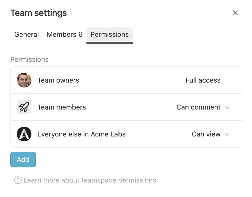 bei Teamspace-Berechtigungen oder für sonstige Workspace-Mitglieder unter dem Punkt Allgemeiner Zugriff