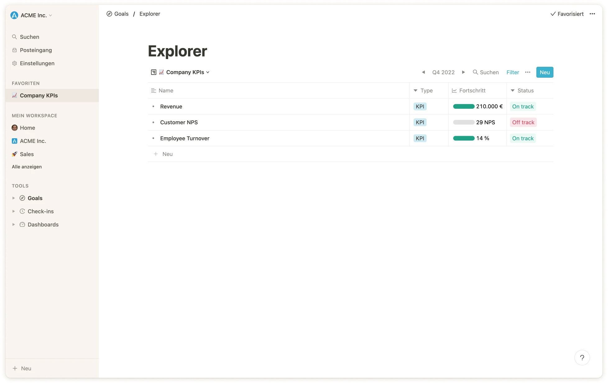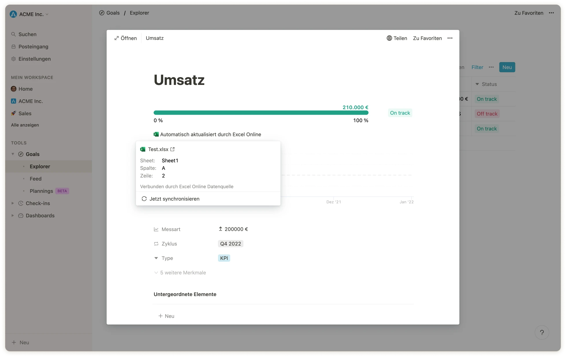 Im Anschluss können die KPIs entweder manuell oder per Integration aktualisiert werden. Manuelle Aktualisierung Genau wie bei anderen Zieltypen auch, können die KPIs über die Kaskadenansicht oder auf der Detailseite des Ziels aktualisiert werden. Mehr dazu findest du in diesem Helpcenter-Artikel: Fortschritt von Zielen aktualisieren Automatische Aktualisierung per Integration Die KPIs können auch automatisch aktualisiert werden, indem diese mit anderen Services wie Excel, Jira oder Google Sheets verknüpft werden. Mehr dazu findest du in diesem Helpcenter-Artikel: Datenintegrationen mit Zielen und OKRs verknüpfen