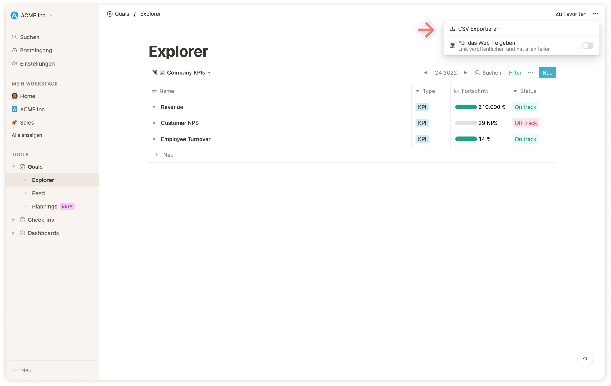 Um die Daten einer Ansicht zu exportieren, navigiere zu der betreffenden Ansicht und klicke oben rechts auf die Ellipsis... und wähle CSV exportieren aus.