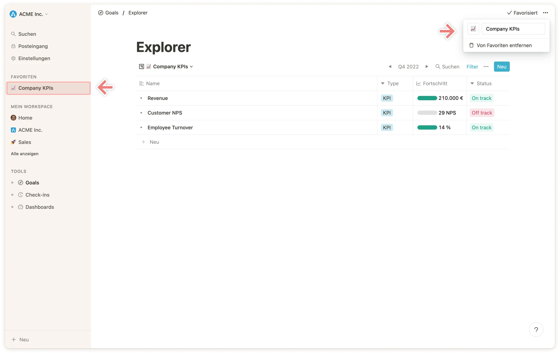 Um die wichtigsten KPIs schnell zugänglich zu haben, können diese als Favorit zur Seitenleiste hinzugefügt werden.