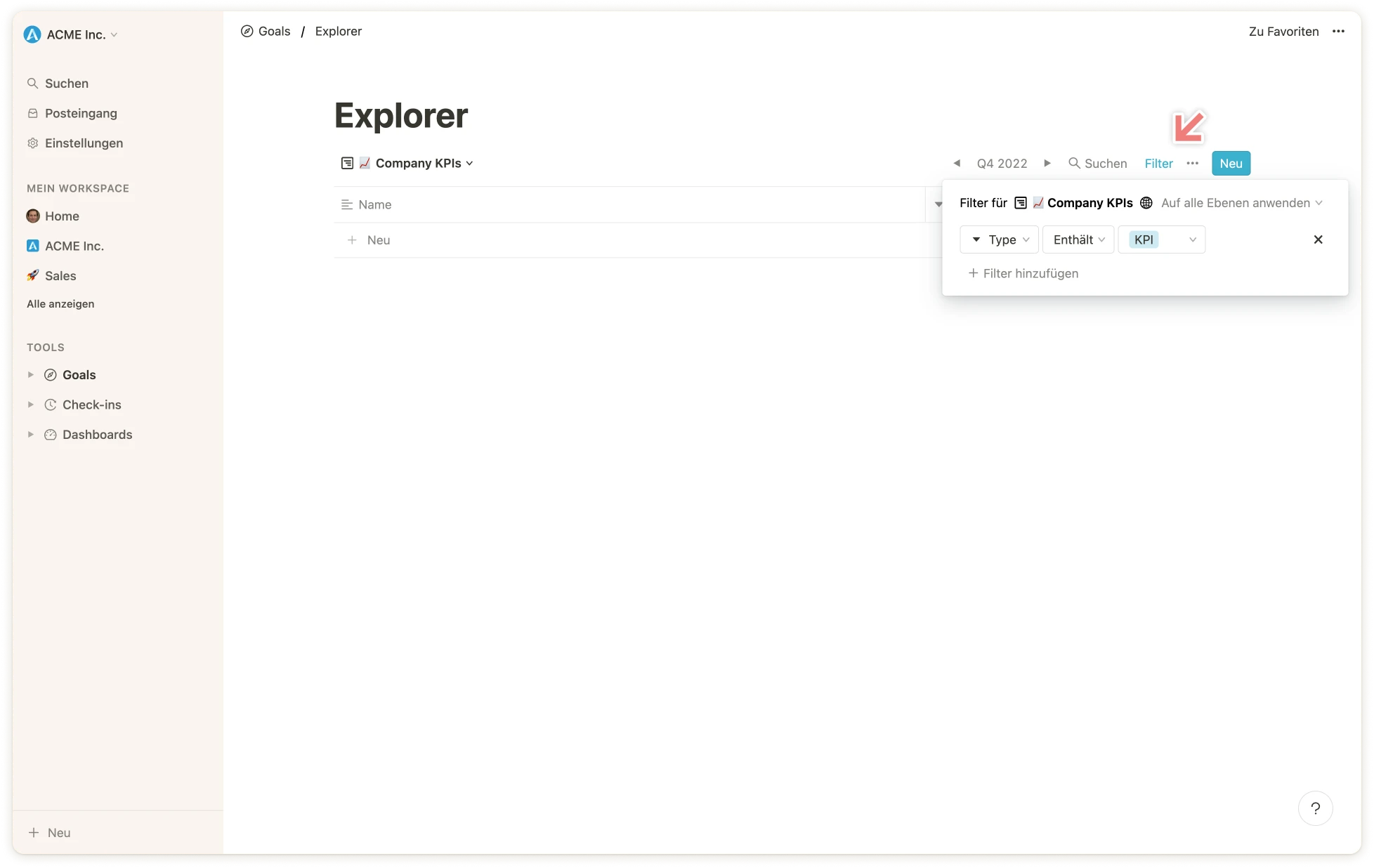 Um einen KPI (Key Performance Indicator) in Mooncamp anzulegen, navigiere zu den Zieltypen in den Einstellungen und klicke aufNeu, benenne den Typ (z.B. KPI) und klicke auf Speichern.