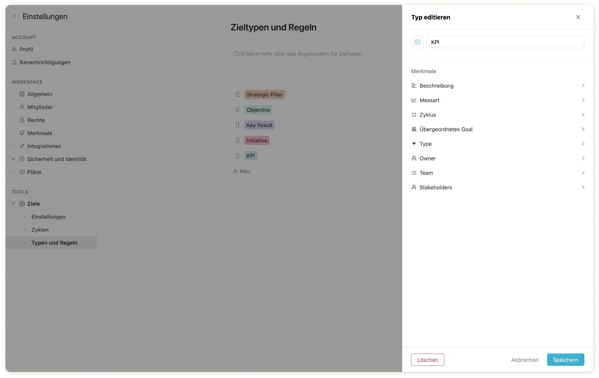 Einstellungen > Ziele > Typen und Regeln alle angelegten Zieltypen in deinem OKR- bzw. Zielmanagement-System, wie z.B. Objective, Key Result oder Initiative.