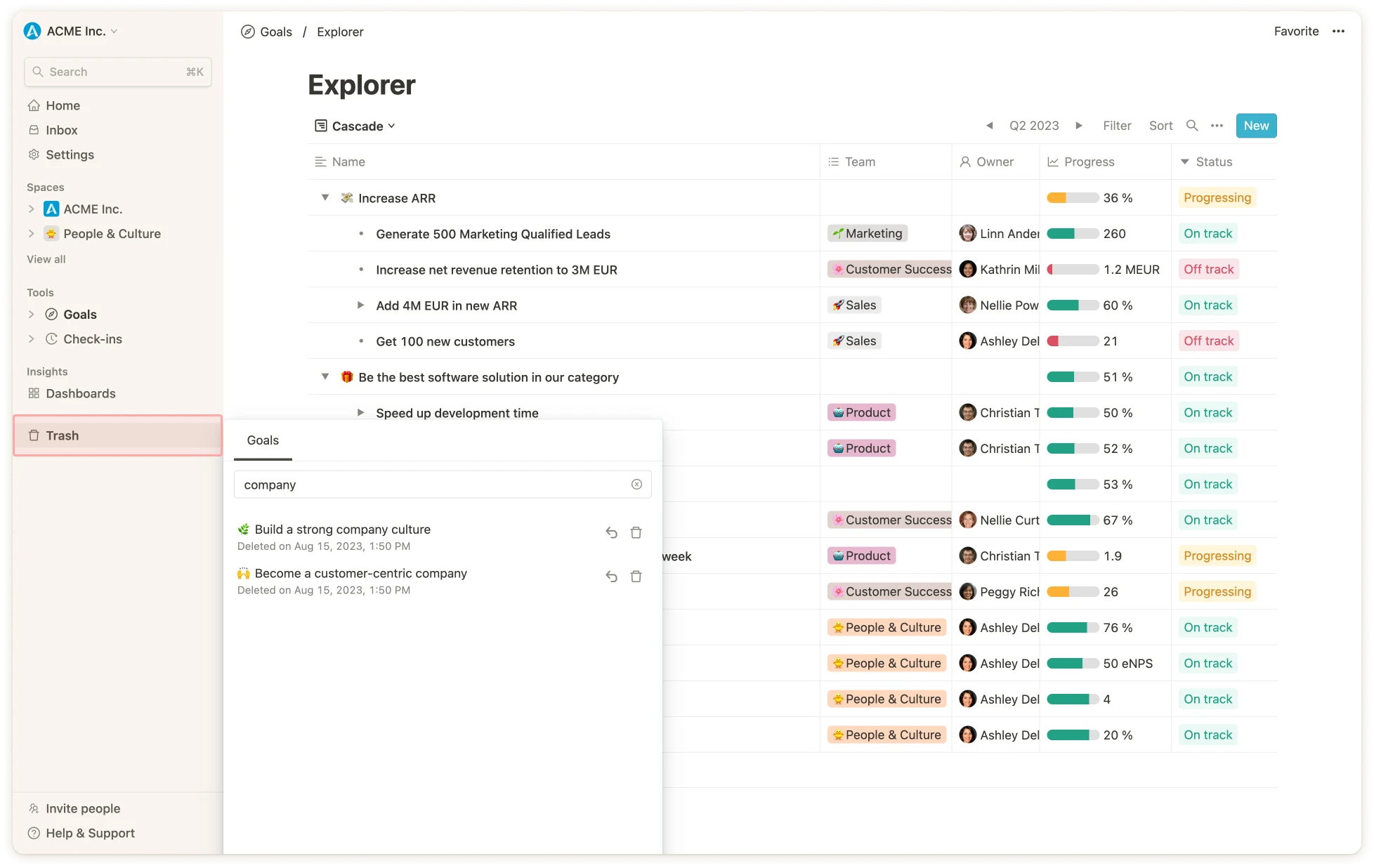 In case you have accidentally deleted one or several goals, you can easily get these back via the trash button on the sidebar. When you navigate to the trash bin, a modal opens and shows all recently deleted goals including a deletion date and time stamp. Next to each goal you find two buttons, one to restore the item, one to delete it permanently. Via the search bar you can also search for specific goals that might have been deleted longer ago. A goal can be restored or permanently deleted by every user who had edit access rights to the goal, irrespective of who has deleted it.