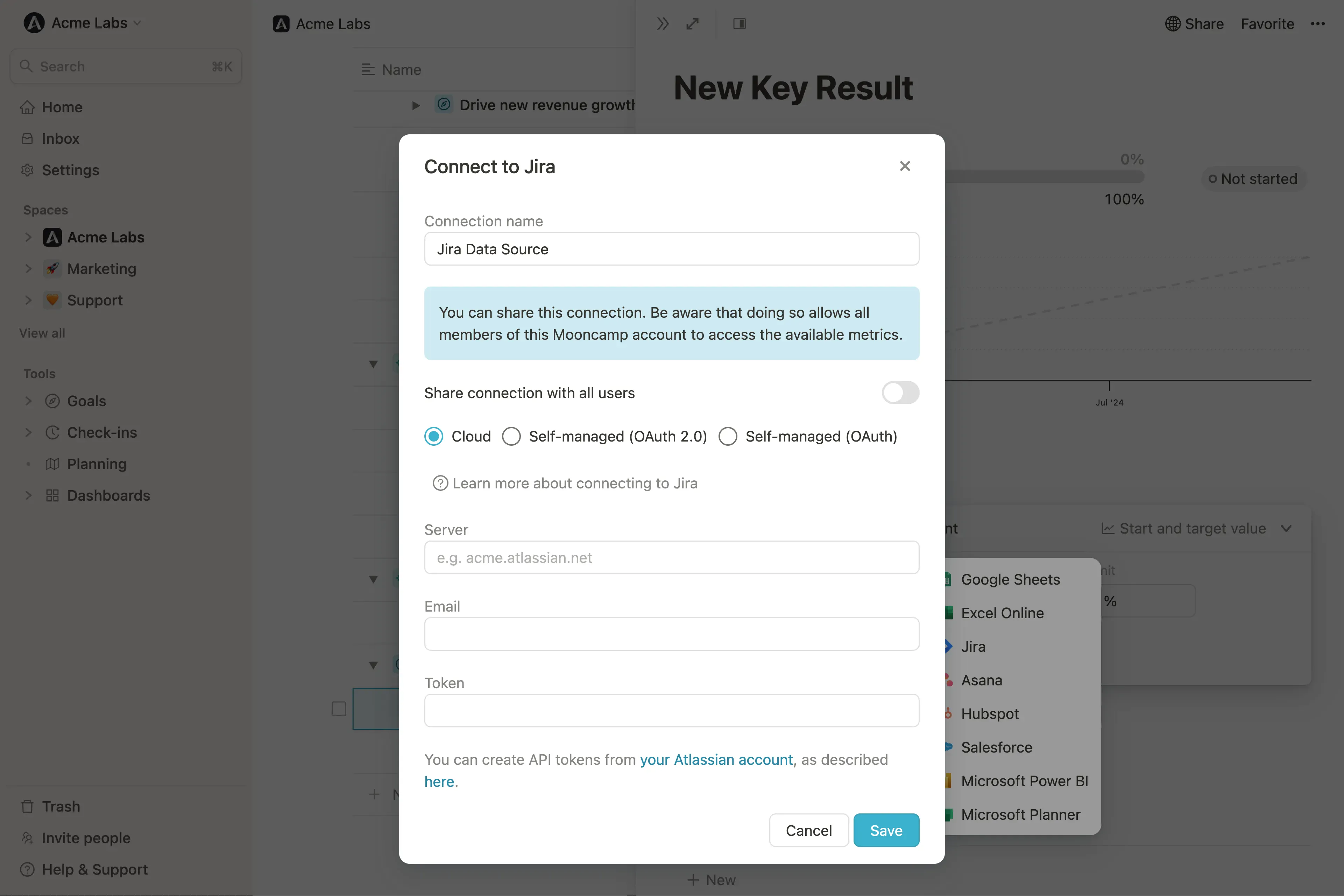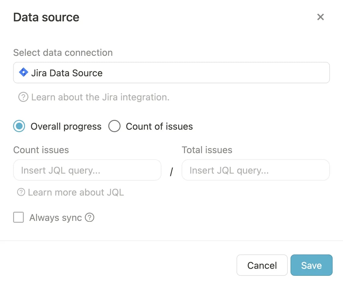 Schritt 1: Verknüpfe ein Ziel mit Jira, indem du unterFortschritt auf Start- und Zielwert und dann auf Mit Datenquelle verbinden klickst. Es öffnet sich ein Fenster, in dem du Informationen zur Integration angeben musst.