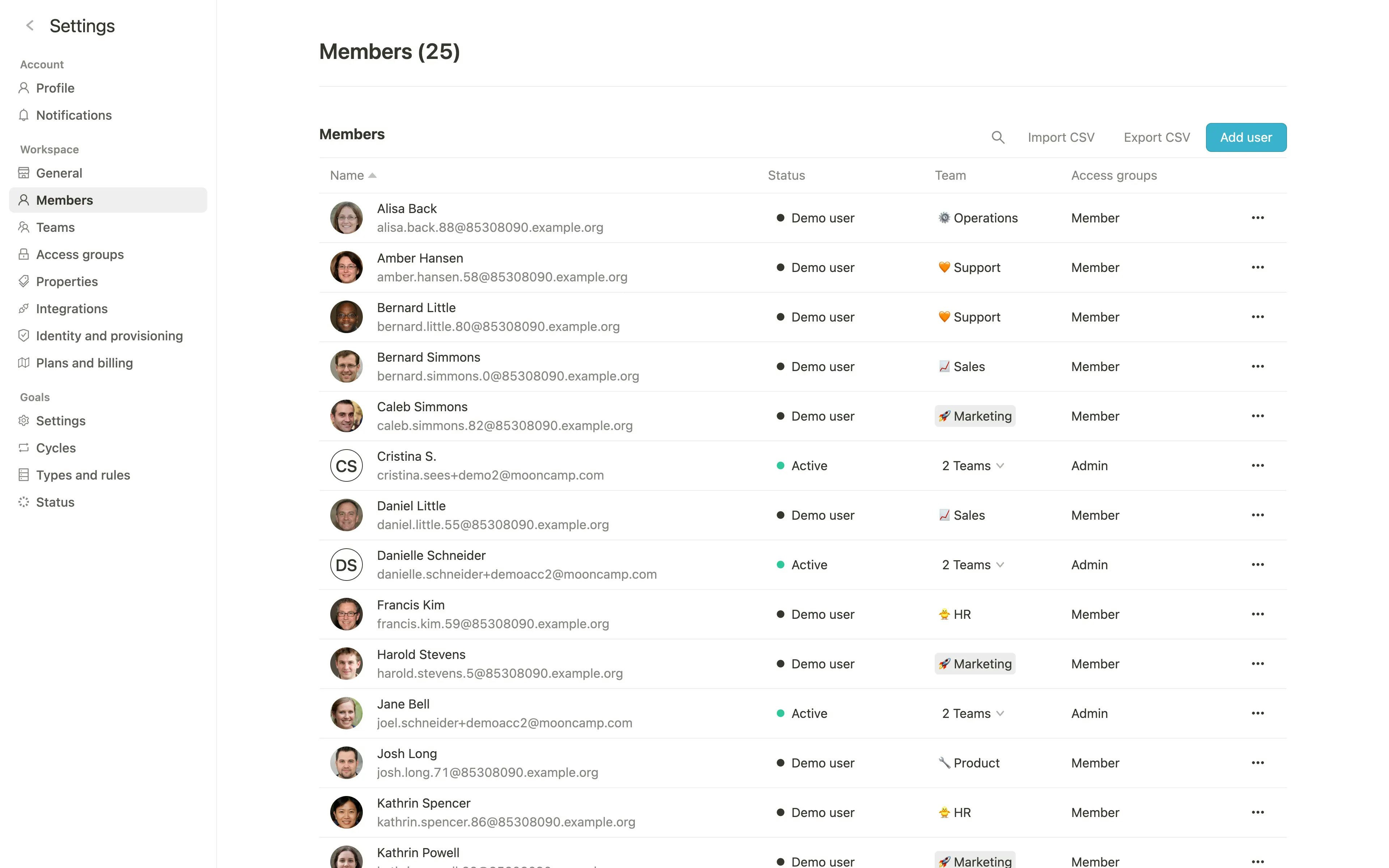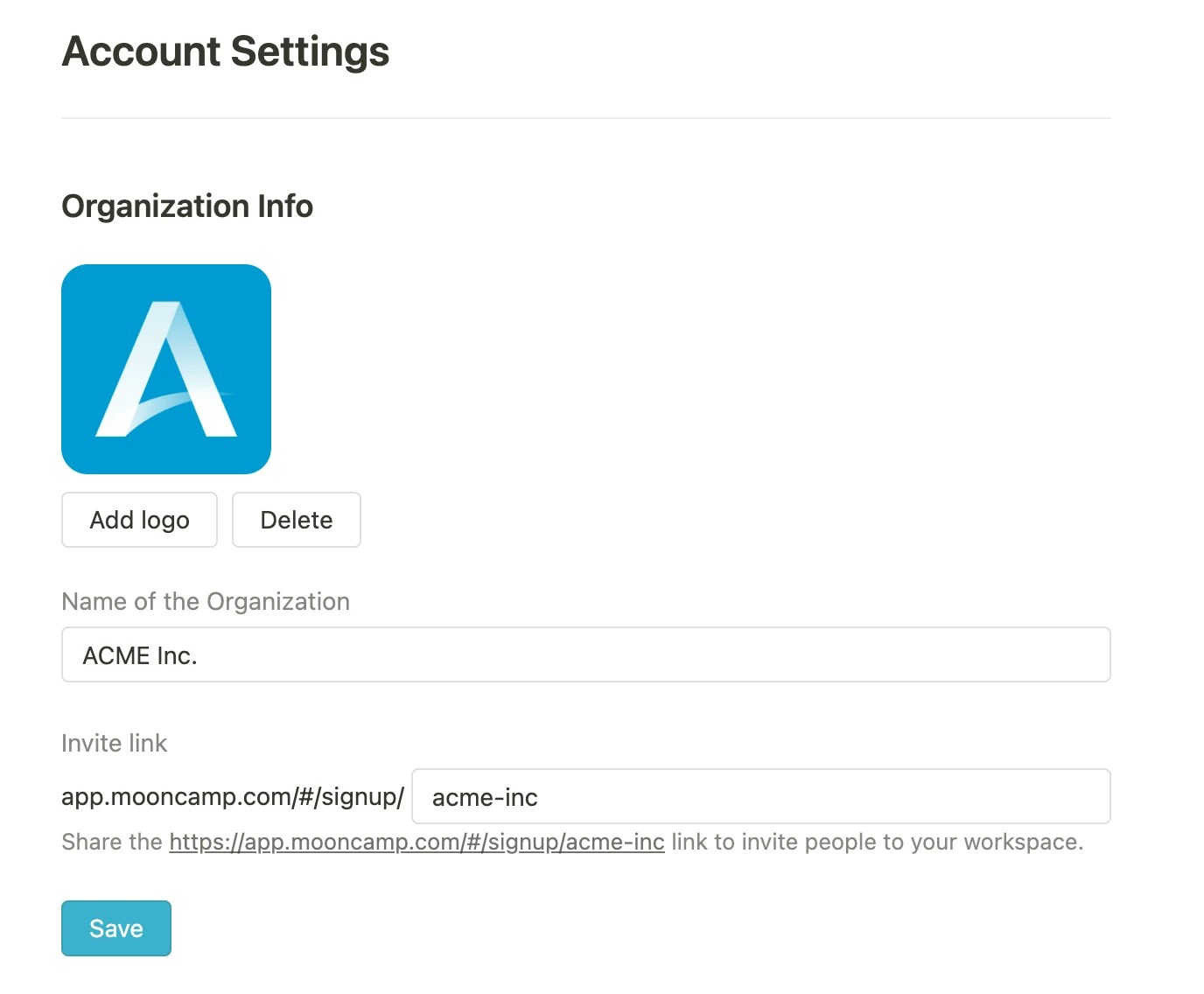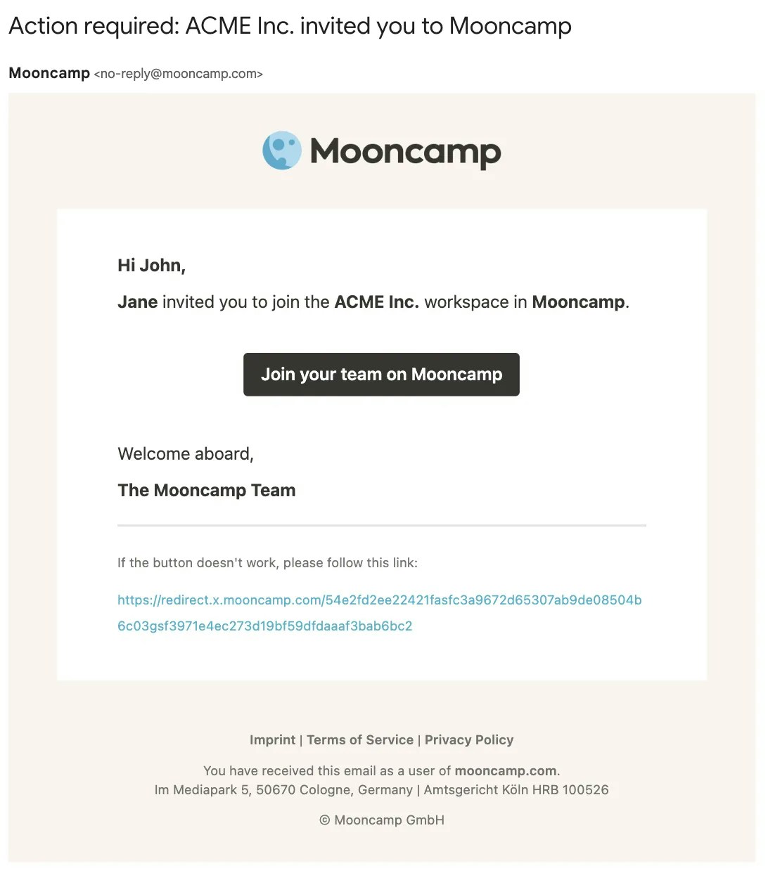 Nachdem alle Mitarbeiter erfolgreich hinzugefügt wurden, kannst Du den Einladungs-Link verwenden, um bestehende Benutzer gemeinsam zu Mooncamp einzuladen. Der Link befindet sich unterEinstellungen > Allgemein und kann dort kopiert werden. Mitarbeiter können sich über den Link einfach registrieren; wichtige Voraussetzung dafür ist, dass sie bereits innerhalb von Mooncamp unter Einstellungen > Mitglieder angelegt wurden.