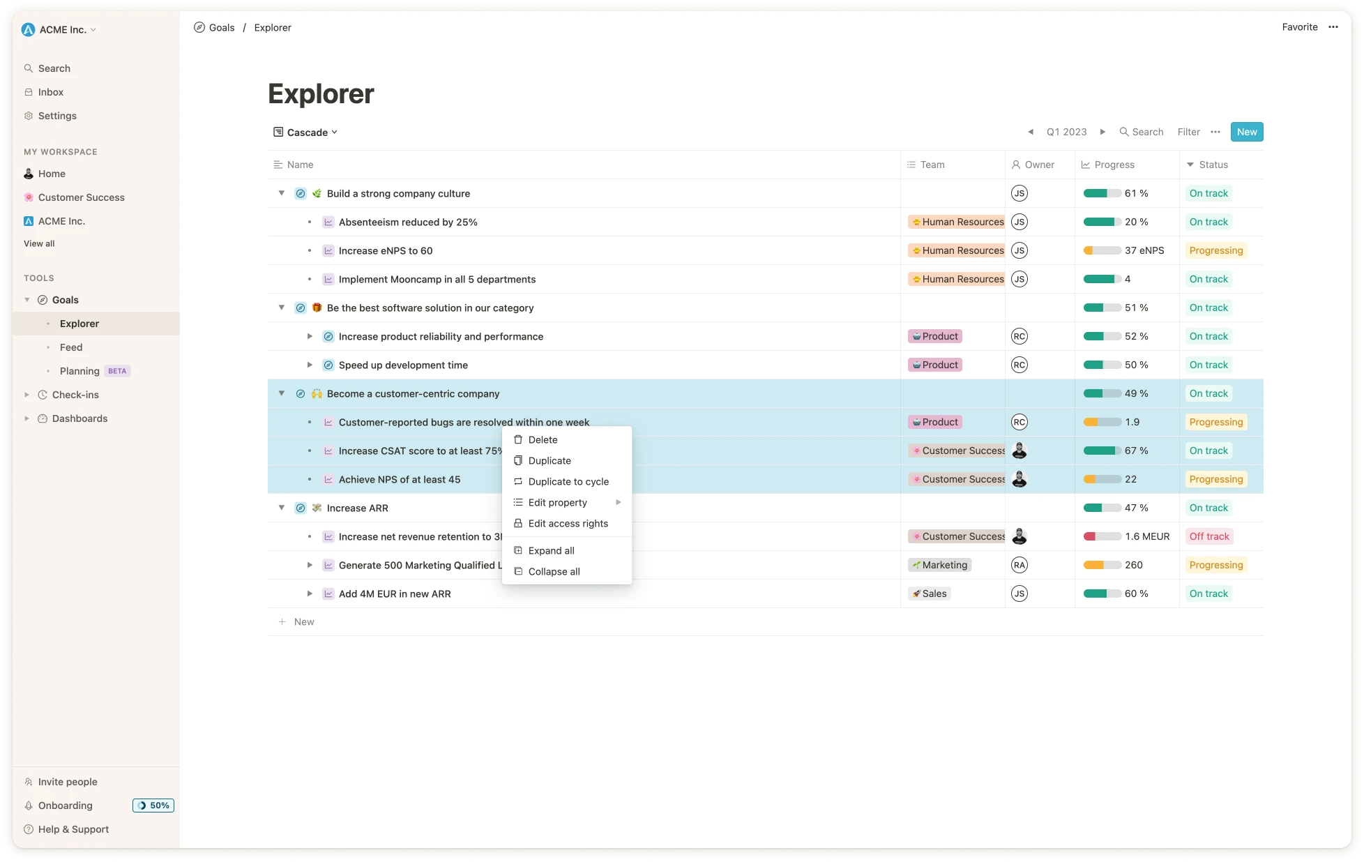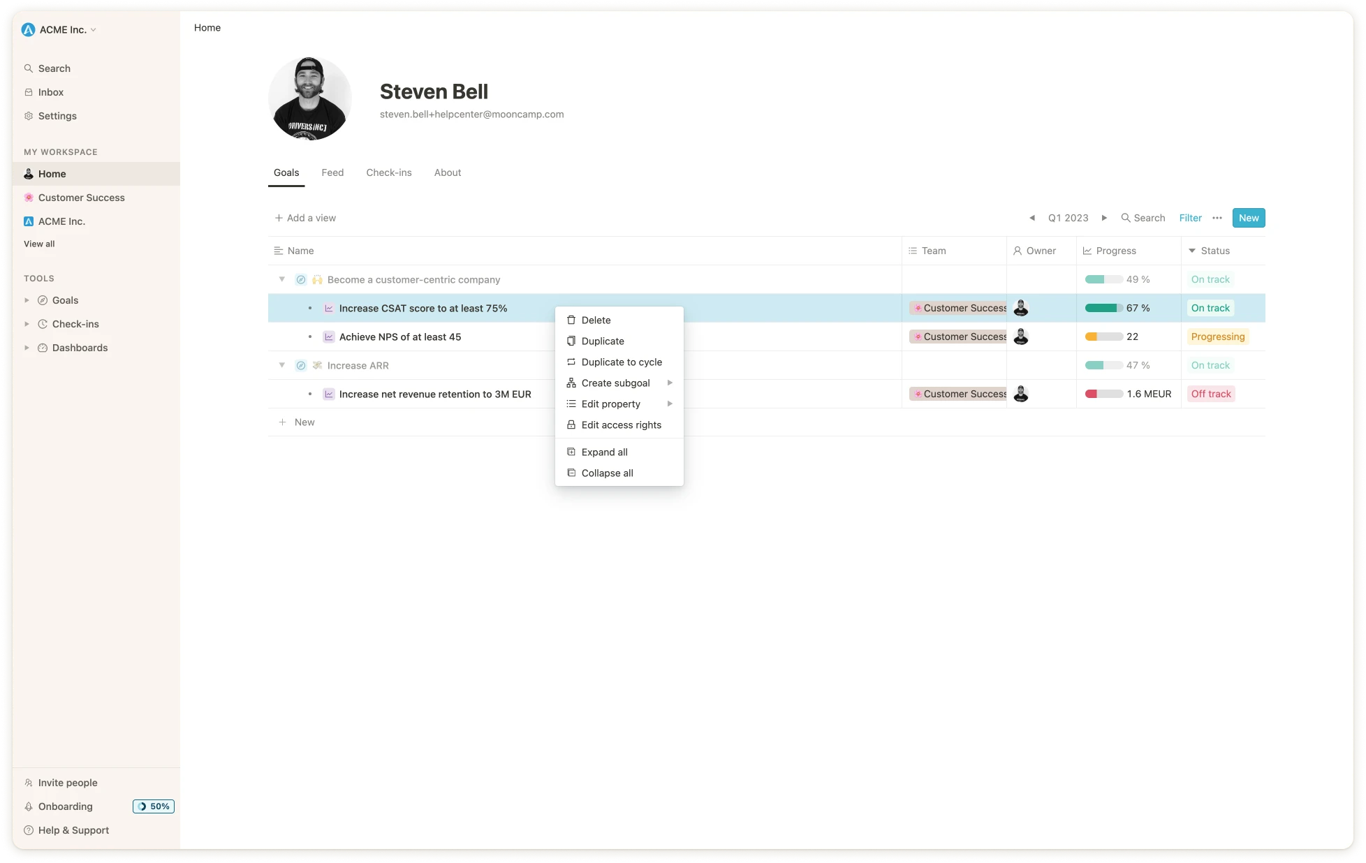 When you are working in Mooncamp and are looking at a list of your goals, you can hover over a goal and then right-click. You will then be presented with a menu which will give you different options to choose from. You also have the possibility to multi-select a group of goals in order to use the right-click function to bulk-edit your goals. This is quite convenient because you don’t have to open the goal to make changes.How to use the right-click function