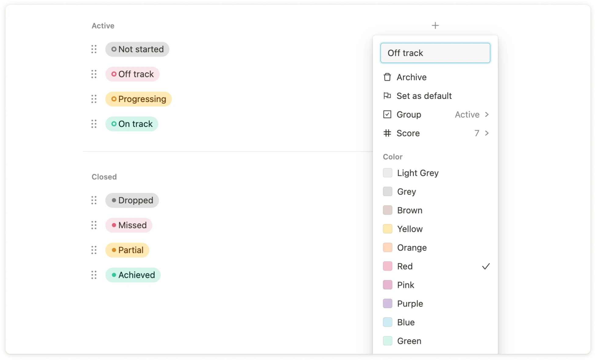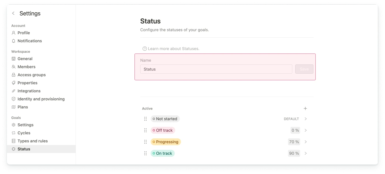 With this feature, you can set a status as the default. A default status is automatically selected if a goal has no updates yet. A default status cannot be archived. First, it must be changed to a non-default status.Group