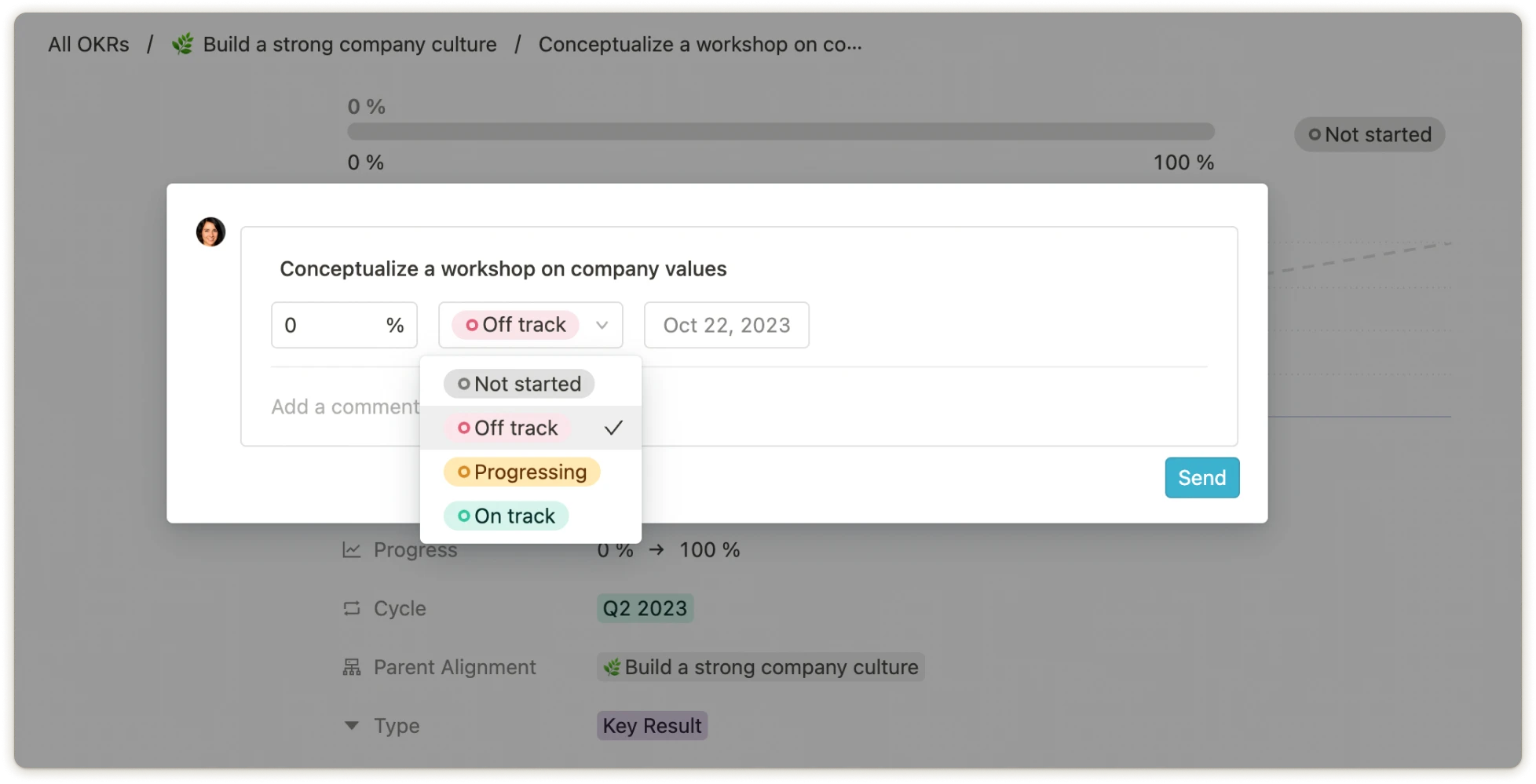 . These are all adjustable, and you can essentially assign any number to tailor the statuses to your individual goal system and processes. For example, it would also be possible to represent a confidence scale from 0 to 10, as this is quite commonly used in the OKR world.