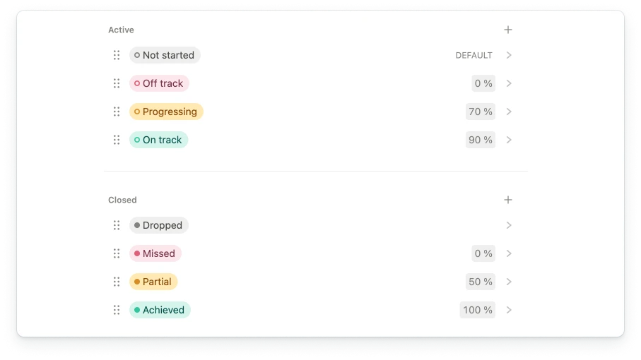 . This default status is assigned to all newly created goals that have no progress updates yet. It is also fully customizable (for more information on evaluations, groups, and defaults, see below). You can easily rearrange these statuses within their respective groups by using the dragging and dropping the different statuses. By clicking the arrow on the right side, you can view and edit the settings of a status:
