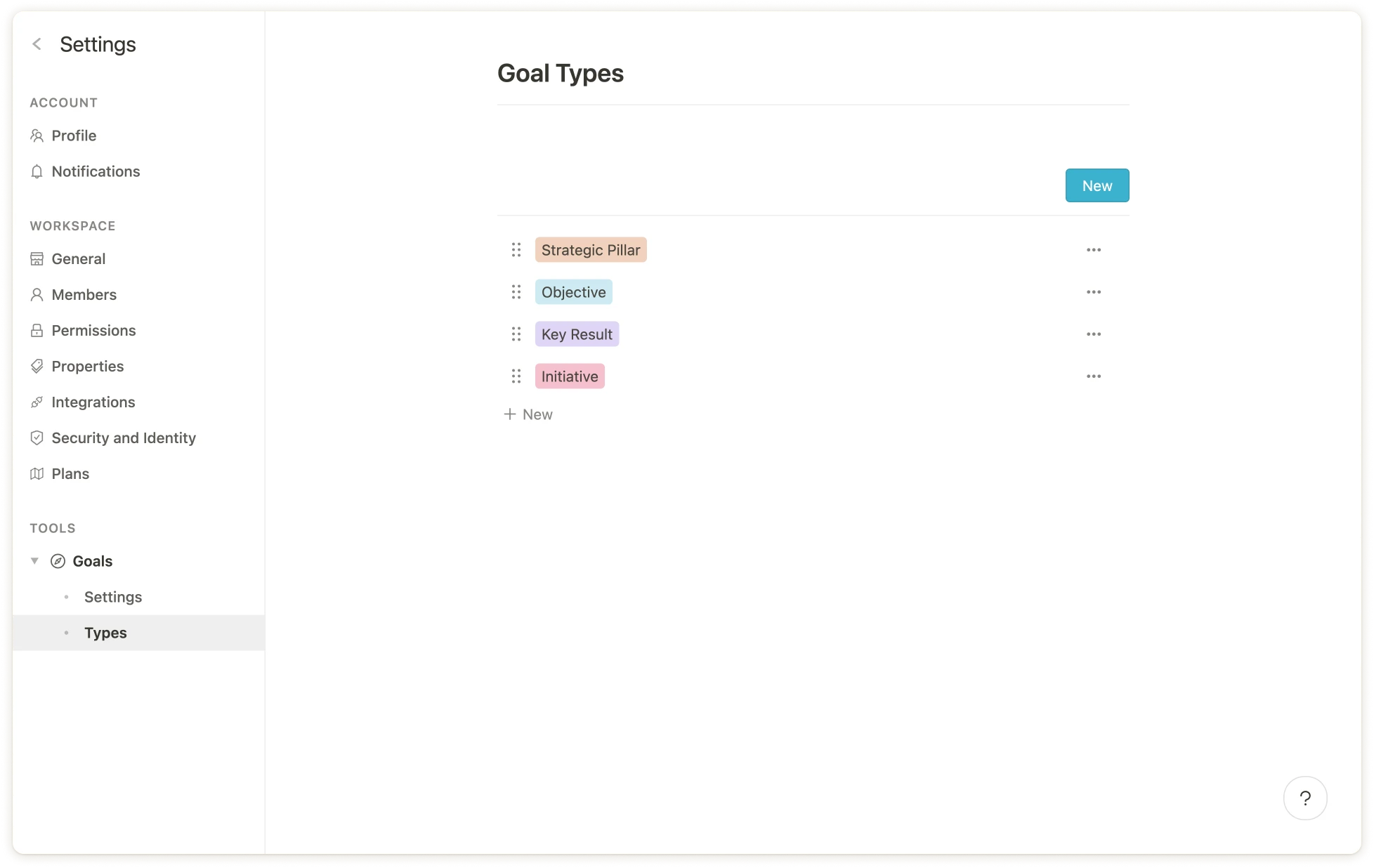 As an admin, via Settings > Goals > Types and rules you find the two pre-defined goal types Objectives and Key Results. Via the New buttons you can add your own goal types, e.g. Strategic Pillars, Initiatives or Tasks. Once you have a longer list of goal types, the six-point icon on the left helps you to drag and drop them into the chosen hierarchy. Via the ellipsis...